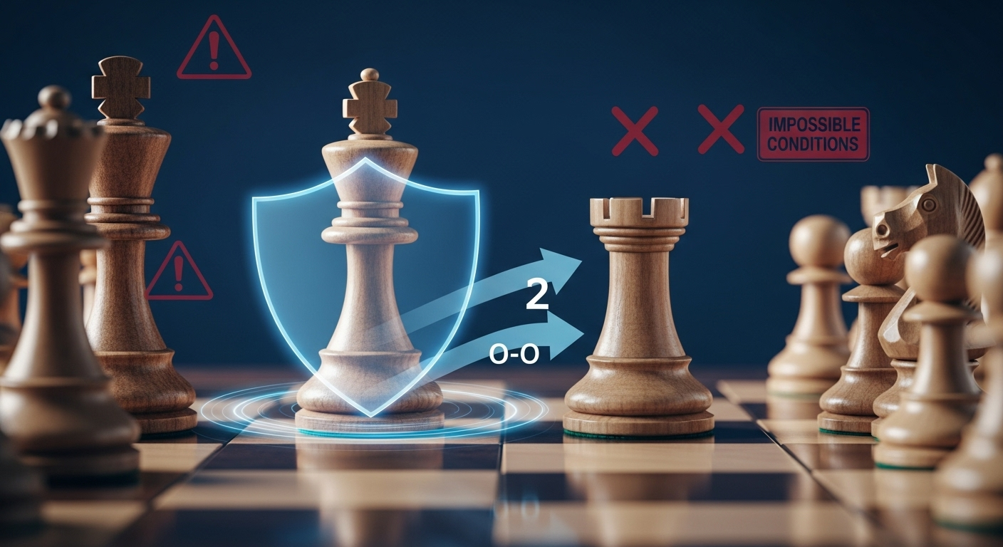 실전에서 캐슬링 가능 여부를 빠르게 판단하려면, 캐슬링이 불가능한 대표적인 조건들을 명확히 알고 있어야 합니다. 특히 '킹의 안전'과 관련된 조건이 가장 중요합니다.
