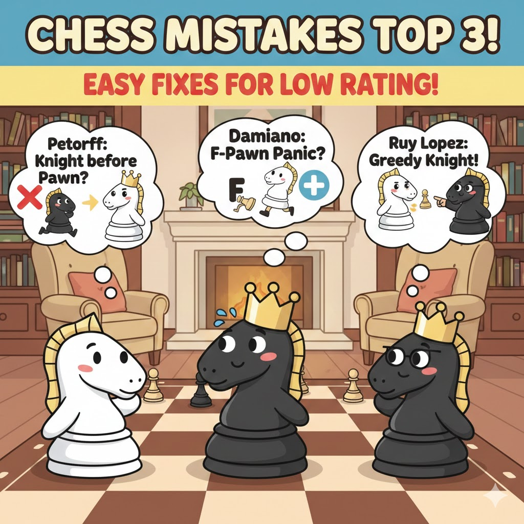 두 번째 **체스 오프닝 실수 TOP 3**는 '다미아노 디펜스(Damiano Defense)'입니다. 오프닝 격언 중 "F폰을 움직이지 마라"는 말이 있습니다. F폰은 킹을 보호하는 가장 중요한 폰이기 때문입니다. 다미아노 디펜스는 이 격언을 정면으로 위반하는 대표적인 실수입니다.