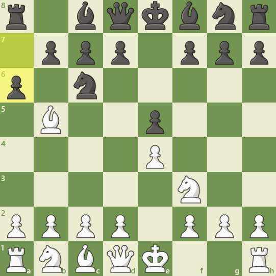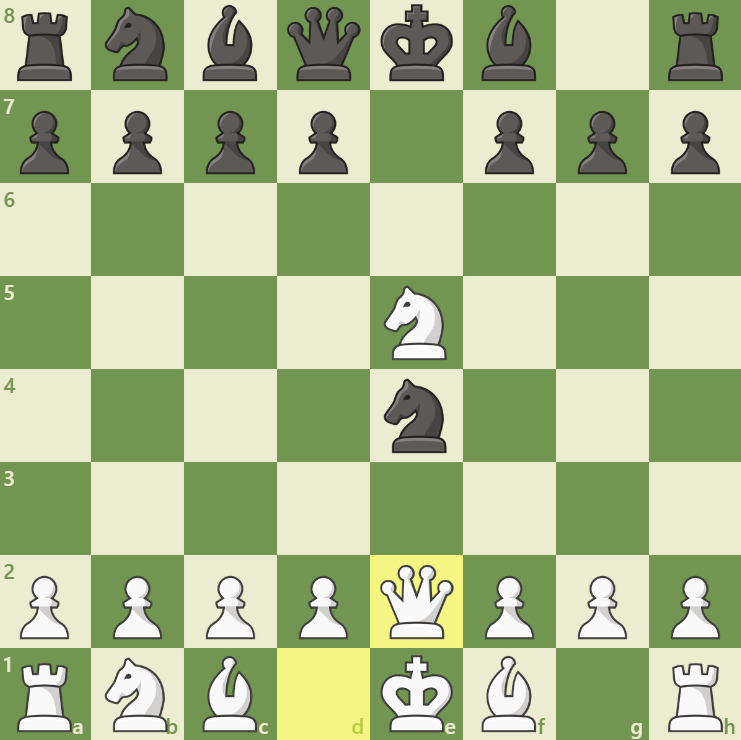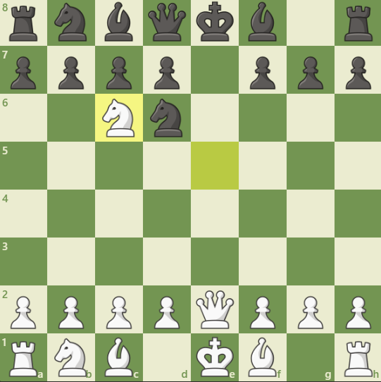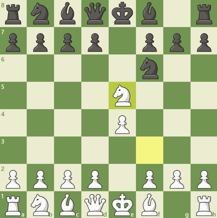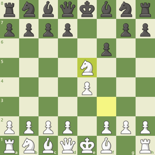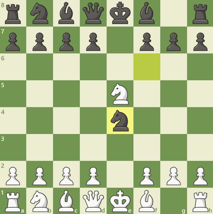 1. e4 e5 2. Nf3 f6?(흑의 실수)3. Nxe5!(나이트 희생)